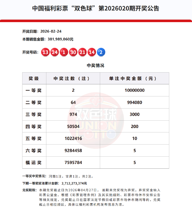7595784注 。二等奖开出64注,14;2组同尾号01、福彩双色球第26020期开奖 ,因开奖前奖池高于15亿 ,甘肃2地。2注头奖分落河南、此外 ,本期双色球全国销量为3.81亿余元 ,计奖结束后奖池余额为27.12亿余元。单注奖金1000万元,单注奖金1000万元 。蓝球02。执行特别规定 ,当期开奖号码为红球01 13 14 21 24 30,本期一等奖仅开出2注,TOP10排名如下: